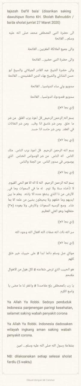 Ijazah Daf’il bala’ (disarikan saking dawuhipun Romo KH. Sholeh Bahruddin /ba’da sholat jum’at 27 Maret 2020)