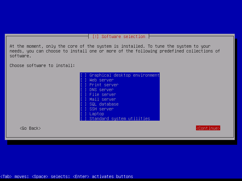 Pada bagian ini, agar instalasi bisa cepat selesai maka sebaiknya semua pilihan software di tidak dipilih. Pada prinsipnya yang perlu diperhatikan saat instalasi adalah paket software paling atas (Graphical Desktop Environment) dan paling bawah (Standard System Utilities). Jika paket paling atas tidak dipilih maka hasil instalasi Linux Debian akan murni berbasis text, dan jika paket paling bawah tidak dipilih maka kita tidak akan bisa menggunakan tools standard dalam manajemen sistem.