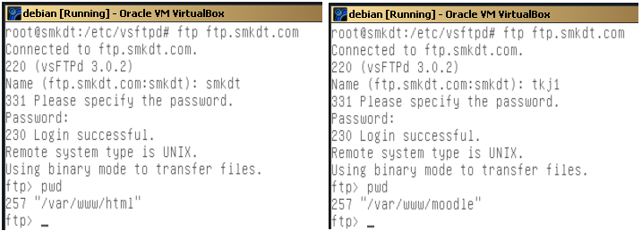 13. testing via filezilla ftp client dari pc client. output user smkdt (atas) dan output user tkj1 (bawah)