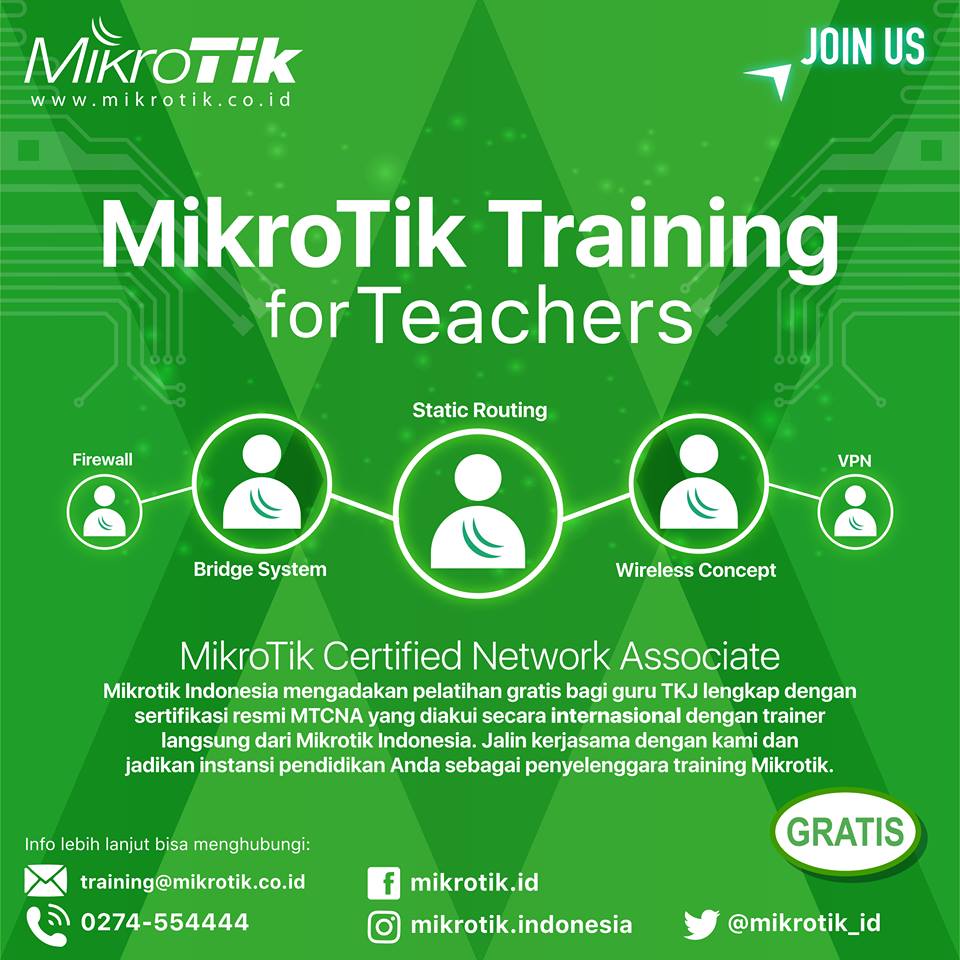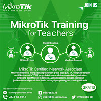 Mikrotik Traing for Teacher dan Mikrotik Certified Network Associate di SMK Darut Taqwa pada tanggal 18-21 April 2017.ย Trainer : Pujo Dewobroto dan Eko Purwanto.ย Peserta : 24 guru TKJ dari 20 SMK se-Kabupaten Pasuruan.ย Hasil sertifikasi : 21 dari 24 peserta lulus.ย