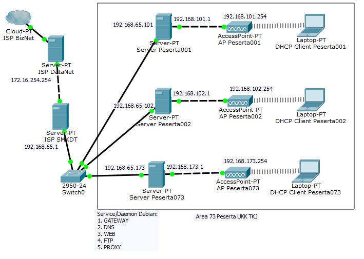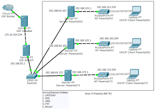 4. Server Siswa (eth0) : 192.168.65.1xx (xx = nomer peserta, contoh 1xx=101, 102, 173)