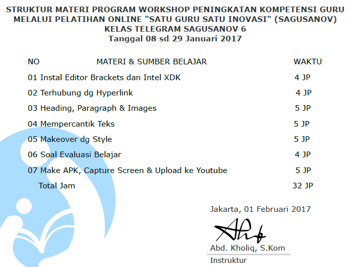 Alhamdulillah, beberapa guru TKJ SMK Darut Taqwa berhasil lulus dalam pelaksanaan workshop satu guru satu inovasi tahap ke 6 (Sagusanov 6) yang diselenggarakan oleh IGI (Ikatan Guru Indonesia). Semoga ilmu yang didapatkan bisa bermanfaat. Amin…
